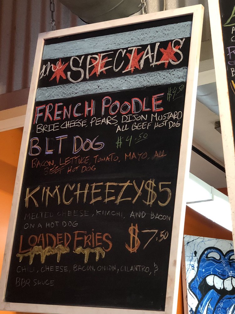 Mustard, onions and sauerkraut. Served with chili cheese frips and a drink.